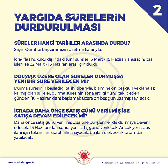 Resmi Gazetede yayımlanan Cumhurbaşkanlığı kararıyla, yargı alanında öngörülen süreler, 30 Nisan tarihine kadar durdurulmuştu. Bugünkü Resmi Gazetede yayımlanan kararla, bu süreler 15 Haziran2a kadar uzatılmıştır.