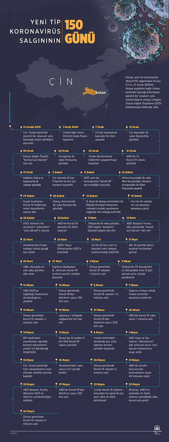 Kovid-19 salgınının ilk kez duyulmasından bu yana geçen 150 günlük sürede yaşanan belli başlı gelişmeler ve dönüm noktaları şunlar oldu:
