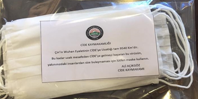 Kastamonu'nun Cide ilçesinde yeni tip koronavirüse karşı vatandaşların köylerine kadar giderek maske dağıtan Kaymakam Ali Açıkgöz'ün, maskelerle birlikte verdiği, "Çin'in Wuhan eyaletinin Cide'ye uzaklığı tam 9 bin 540 kilometredir. Bu kadar uzak mesafeden Cide'ye gelmeyi başaran bu virüsün yakınlarınızdaki insanlardan size bulaşmaması için lütfen maske takın" notu da dikkat çekiyor