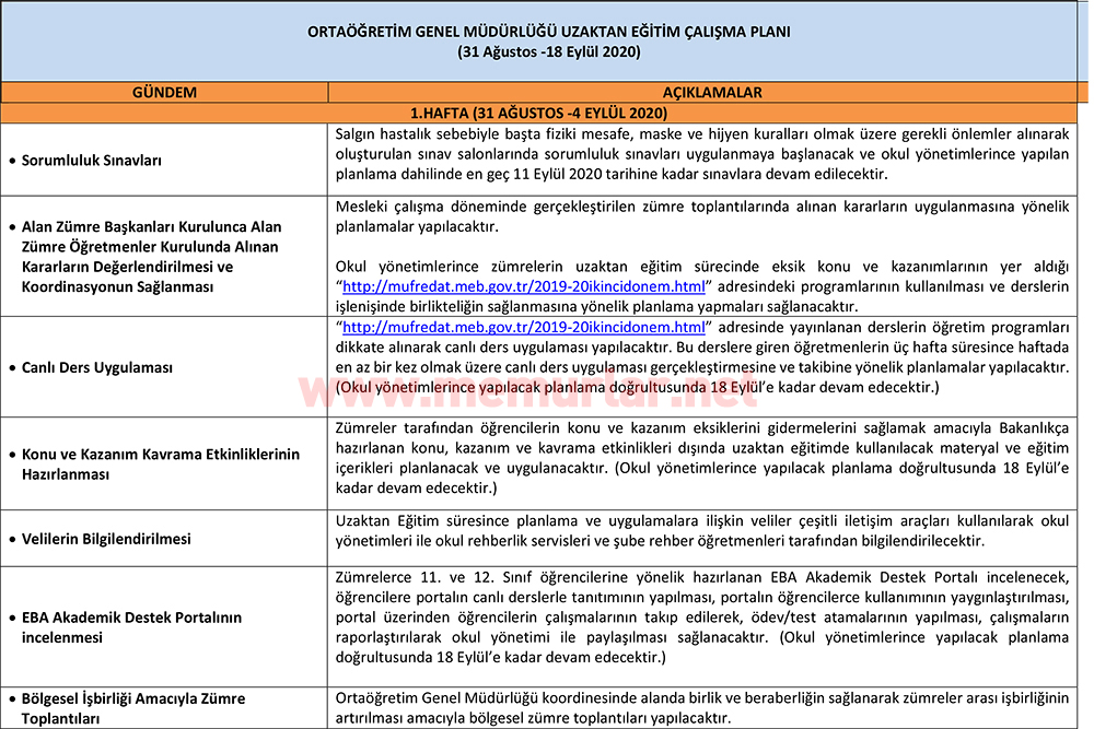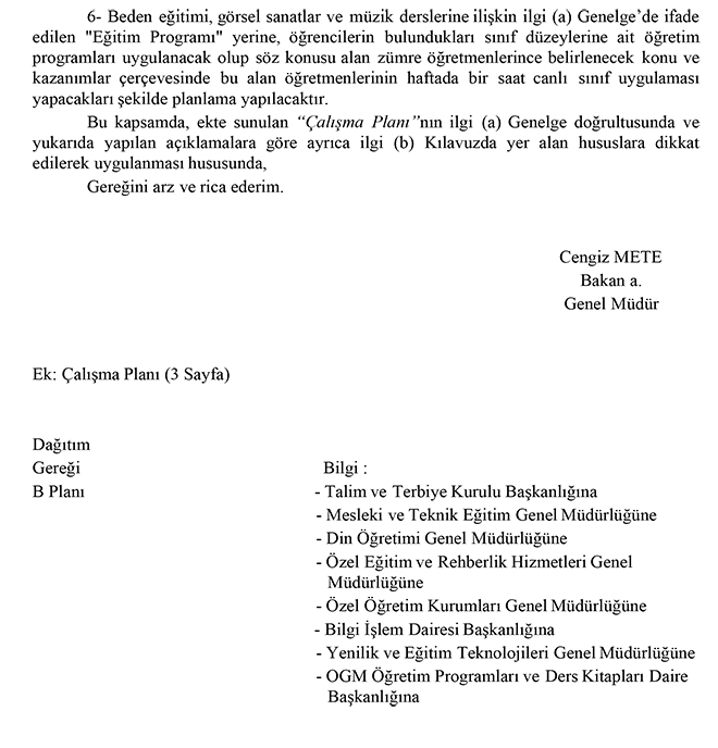 Milli Eğitim Bakanlığı Ortaöğretim Genel Müdürlüğü ve Temel Eğitim Genel Müdürlüğü Uzaktan Eğitim Çalışma Planı hazırladı. Gönderilen resmi yazılara göre, öğretmenler dönüşümlü olarak okula gidecek