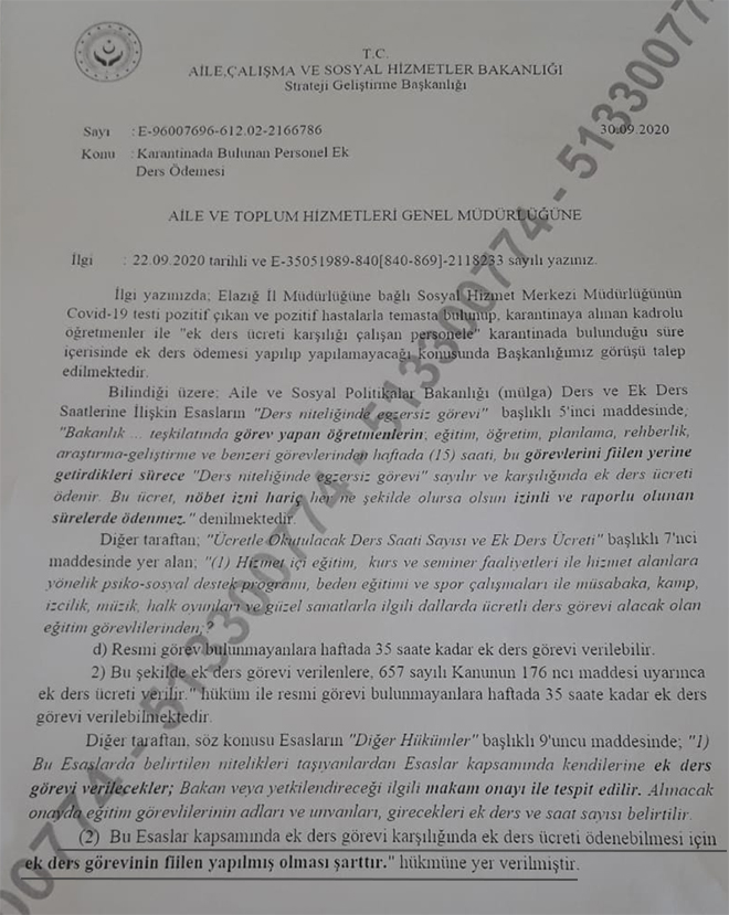Aile, Çalışma ve Sosyal Politikalar Bakanlığı Strateji Geliştirme Başkanlığı karantinada bulunan öğretmenlere ek ders ücreti verilmeyeceğini belirtti.