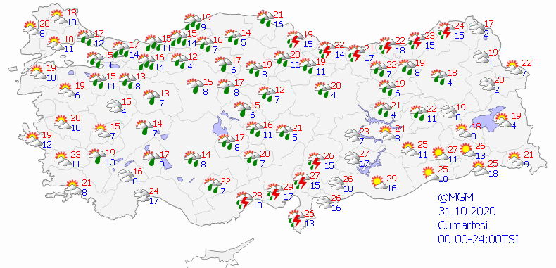 Meteoroloji Genel Müdürlüğü tarafından yapılan son değerlendirmelere göre; Ülkemizin kuzey, iç ve batı kesimlerinin parçalı ve yer yer çok bulutlu, Marmara, Ege, Batı Akdeniz, İç Anadolu'nun kuzeybatısı ve Batı Karadeniz ile Kırşehir, Yozgat, Amasya, Samsun, Çorum, Tunceli, Bingöl, Erzurum ve Kars çevrelerinin aralıklı sağanak ve gök gürültülü sağanak yağışlı, diğer yerlerin az bulutlu ve açık geçeceği tahmin ediliyor. Yağışların; öğle saatlerinden itibaren İstanbul, Marmara'nın doğusu (Bursa, Yalova, Kocaeli, Sakarya, Bilecik), Antalya'nın Aksu, Serik, Manavgat ve İbradı İlçelerinde, zamanla Batı Karadeniz'in kıyı kesimlerinde (Düzce, Zonguldak, Bartın) kuvvetli (21-50 kg/m2); İstanbul'un Anadolu Yakasının kuzey kesimleri, Kocaeli'nin Kandıra, Sakarya'nın Kaynarca ve Ferizli ilçeleri ile Isparta çevrelerinde yer yer çok kuvvetli (50-75 kg/m2) olması bekleniyor.