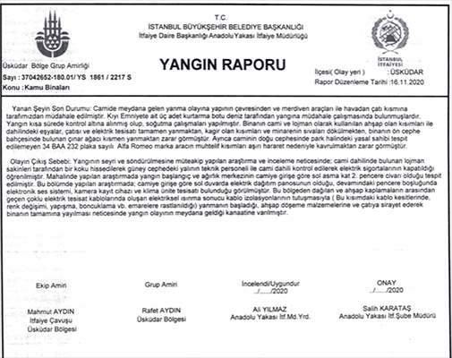 "Yangının seyri ve söndürülmesini müteakip yapılan araştırma ve inceleme neticesinde, cami dahilinde bulunan lojman sakinleri tarafından bir koku hissedilerek güney cephedeki yalının teknik personeli ile cami dahili kontrol edilerek elektrik sigortalarının kapatıldığı öğrenilmiştir. Mahallinde yapılan araştırmada yangın başlangıç ve ağırlık sebebinin camiye girişe göre sol asma kat 2. pencere civarı olduğu tespit edilmiştir. Bu bölümde yapılan araştırmada, camiye girişe göre sol duvarda elektrik dağıtım panosunun olduğu, devamındaki pencere boşluğunda elektronik ses sistemi, kamera kayıt cihazı ve klima ünite tesisatı bulunduğu görülmüştür. Bu bölgeden dağılan ve ahşap kaplamaların arasından geçen çoklu elektrik tesisat kablolarında oluşan elektriksel ısınma sonucu izolasyonlarının tutuşmasıyla yanmanın başladığı, ahşap döşeme malzemeleri ve çatıya sirayet ederek binanın tamamına yayılması neticesinde yangın olayının meydana geldiği kanaatine varılmıştır."