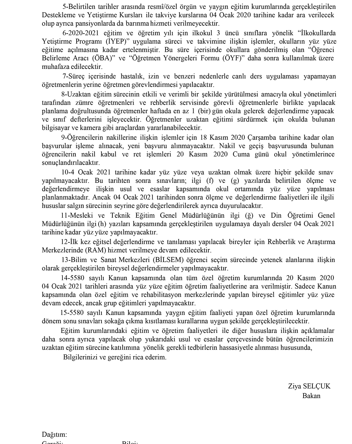 Milli Eğitim Bakanı Ziya Selçuk imzasıyla resmi ve özel örgün eğitim ile hayat boyu öğrenme kurumlarında 20 Kasım 2020'den 4 Ocak 2021'e kadar yüz yüze eğitime verilen araya ilişkin il milli eğitim müdürlüklerine yazı gönderildi.