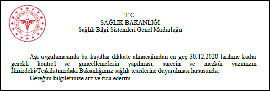 Resmi yazıya göre; Aşı lojistiği ve uygulamada problem yaşanmaması için sistemlerimizde bulunan verilerin kontrol edilerek, eksik ya da hatalı kayıtların düzeltilmesi gerektiği ve Aşı uygulamasında bu kayıtlar dikkate alınacağından en geç 30.12.2020 tarihine kadar gerekli kontrol ve güncellemelerin yapılması istendi. Sadece Bakanlık personeli değil aynı zamanda Özel ve Üniversite Sağlık Tesisleri ile diğer kamu kuruluşlardaki sağlık tesislerinde çalışan personel kayıtları için de ayrı bir yazılım hazırlanmakta olup yazılımın testleri yapılmakta ve en yakın zamanda duyurulacağı bildirildi.