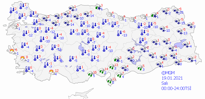 KUVVETLİ YAĞIŞ UYARISI: Yağışların; Marmara'nın doğusu, Batı Karadeniz, Doğu Anadolu'nun güney ve batısı, Gümüşhane, Tokat, Sivas, Kütahya, Çankırı, Tekirdağ'ın Çorlu ilçesi, Çanakkale'nin iç kesimleri, Kahramanmaraş'ın yüksekleri ve Toroslar mevkii ile Ankara ve Eskişehir'in kuzey kesimlerinde kuvvetli ve yer yer yoğun kar, Doğu Akdeniz, Güneydoğu Anadolu'nun batısı, Ordu, Giresun, Trabzon, Rize, Batman, Siirt, Mardin ve Antalya'nın doğusunda kuvvetli yağmur ve sağanak şeklinde olması beklendiğinden meydana gelebilecek olumsuzluklara (ulaşımda aksamalar, su baskını vb) karşı dikkatli ve tedbirli olunmalıdır.