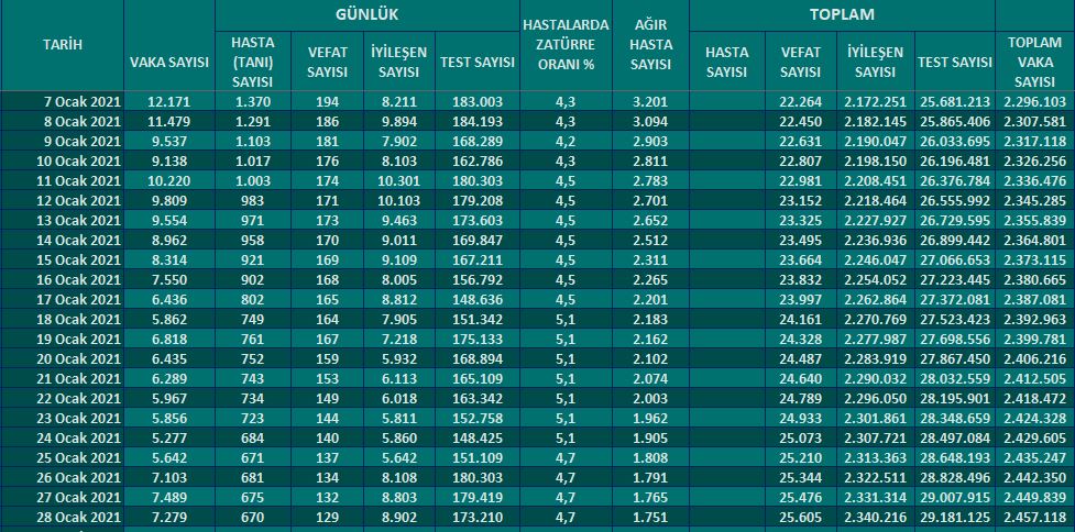 Sağlık Bakanlığı 28 Ocak 2021 tarihli koronavirüs verilerini açıkladı.