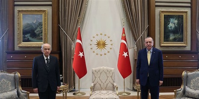 Yeni anayasa tartışmaları başlarken Erdoğan, dün Bahçeli ile Cumhurbaşkanlığı Külliyesi'nde bir araya geldi. Yaklaşık 1 saat süren görüşmede Erdoğan ile Bahçeli yeni anayasa konusunu ele aldı.