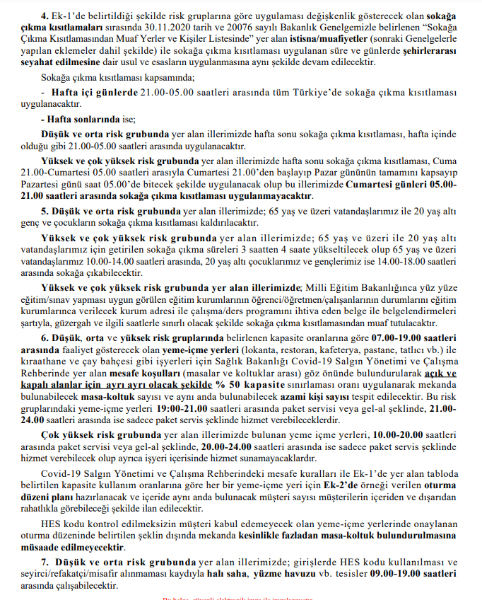- Hafta içi günlerde 21.00-05.00 saatleri arasında tüm Türkiye'de sokağa çıkma kısıtlaması uygulanacaktır.