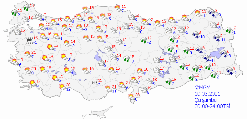 Meteoroloji Genel Müdürlüğü tarafından yapılan son değerlendirmelere göre; Ülkemiz genelinin parçalı ve yer yer çok bulutlu, Doğu Karadeniz, Doğu Anadolu, Güneydoğu Anadolu'nun doğusu ile Osmaniye, Hatay ve Adıyaman çevrelerinin aralıklı yağışlı geçeceği tahmin ediliyor. Doğu Karadeniz kıyıları, Güneydoğu Anadolu'nun doğusu ile Hatay, Osmaniye, Malatya, Elazığ ve Adıyaman çevrelerinde yağmur ve sağanak, yağış alan diğer yerlerde karla karışık yağmur ve kar şeklinde olması beklenen yağışların; Bingöl ve Muş'un yüksekleri, Ağrı ve Kars çevreleri ile Erzurum'un güney ve doğusunda yoğun kar şeklinde olması bekleniyor. Bu sabah ve gece saatlerinde iç ve doğu kesimlerde buzlanma ve don ile birlikte yer yer pus ve sis olayı bekleniyor. Doğu Karadeniz'in iç kesimleri ile Doğu Anadolu'nun güneydoğusunda çığ oluşma tehlikesi bulunmaktadır.