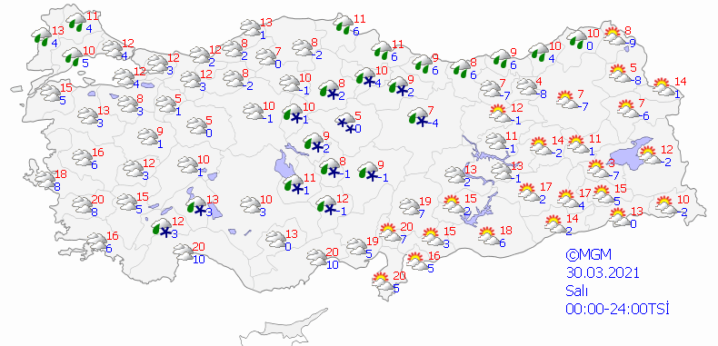 Meteoroloji Genel Müdürlüğü tarafından yapılan son değerlendirmelere göre; ülkemiz genelinin parçalı ve az bulutlu, gece (Pazartesi) saatlerinde İstanbul çevrelerinin yer yer çok bulutlu ve hafif sağanak yağışlı geçeceği tahmin ediliyor. İç ve doğu kesimlerde buzlanma ve don olayı ile beraber yer yer pus ve sis bekleniyor. Doğu Karadeniz'in iç kesimleri ve Doğu Anadolu'nun doğusunda çığ oluşma riski bulunmaktadır.