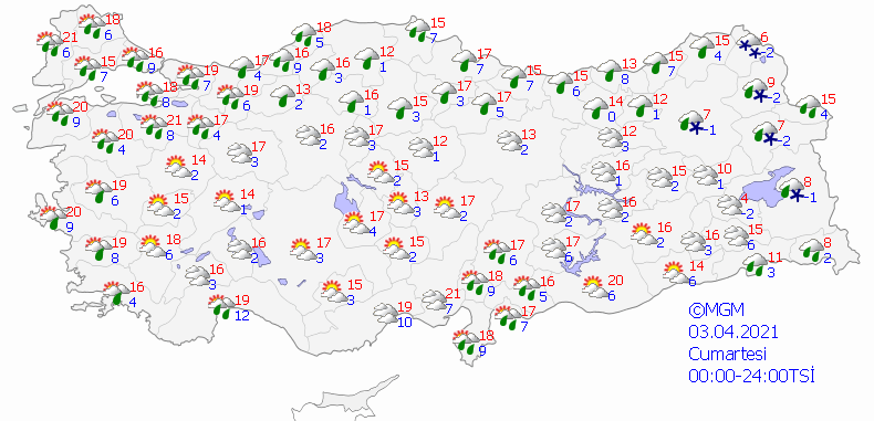 Meteoroloji Genel Müdürlüğü tarafından yapılan son değerlendirmelere göre: Marmara'nın kuzeyi, Orta ve Doğu Akdeniz, İç Anadolu'nun güney ve doğusu, Batı Karadeniz'in doğusu, Orta ve Doğu Karadeniz ile Doğu ve Güneydoğu Anadolu'nun yağışlı, diğer yerlerin parçalı bulutlu geçeceği tahmin ediliyor. Yağışların, genellikle yağmur ve sağanak, Orta ve Doğu Akdeniz ile Güneydoğu Anadolu'da yer yer gök gürültülü sağanak, Batı ve Doğu Karadeniz'in iç kesimleri, İç Anadolu'nun kuzeydoğusu ile Doğu Anadolu'nun kuzey ve doğusunda karla karışık yağmur ve yükseklerinde yer yer kar şeklinde olması bekleniyor. Sabah ve gece saatlerinde Marmara'nın güneyinde ve doğusunda, Kuzey Ege'de ve Batı Karadeniz'in iç kesimlerinde yer yer sis ve pus hadisesi bekleniyor. Doğu Karadeniz'in iç kesimleri ve Doğu Anadolu'nun doğusunda çığ tehlikesi bulunmaktadır.