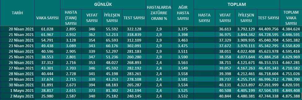Sağlık Bakanlığı 2 Mayıs 2021 tarihli vaka sayılarını açıkladı.