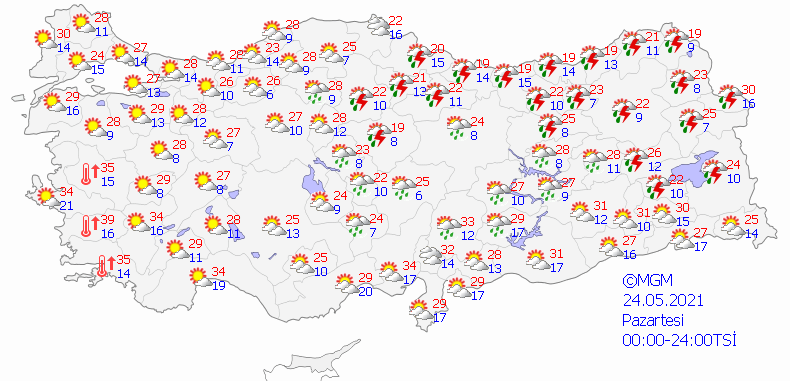 Meteoroloji Genel Müdürlüğü tarafından yapılan son değerlendirmelere göre; Ülkemizin kuzey, iç ve doğu kesimlerinin parçalı ve yer yer çok bulutlu, İç Anadolu'nun doğusu, Orta ve Doğu Karadeniz, Doğu Anadolu'nun kuzeyi ile Çankırı, Bartın, Karabük, Sinop, Kastamonu, Malatya ve Van çevrelerinin yerel olmak üzere aralıklı sağanak ve gök gürültülü sağanak yağışlı, diğer yerlerin az bulutlu ve açık geçeceği tahmin ediliyor. Yağışların; Sinop, Samsun, Ordu, Giresun, Çorum, Amasya, Tokat ve Sivas çevrelerinde yer yer kuvvetli olması bekleniyor.