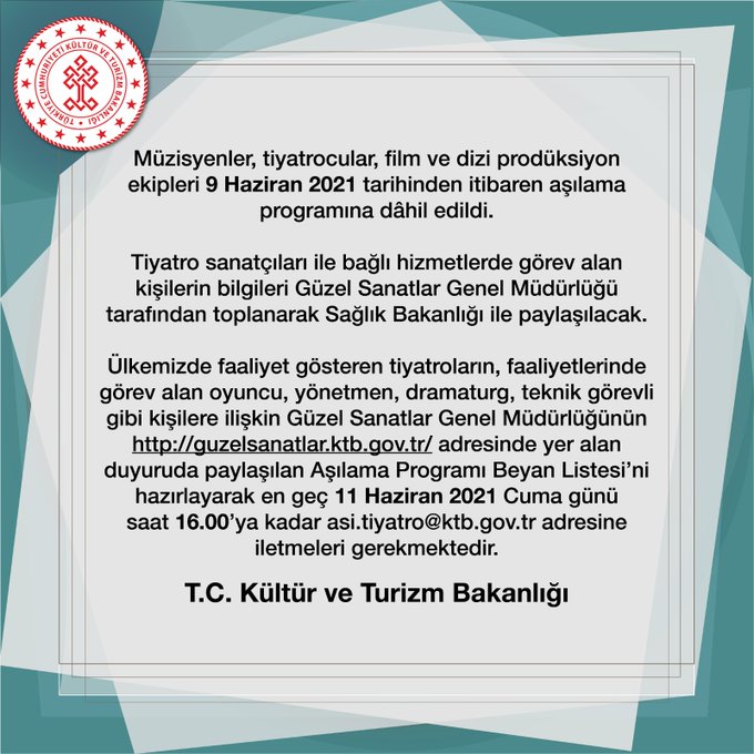 Kültür ve Turizm Bakanlığı, ülkede faaliyet gösteren tiyatroların görev alan oyuncu, yönetmen, dramaturg, teknik görevli gibi kişilere ilişkin Aşılama Programı Beyan Listesi'ni hazırlayarak en geç 11 Haziran Cuma günü saat 16.00'ya kadar iletmeleri gerektiğini açıkladı
