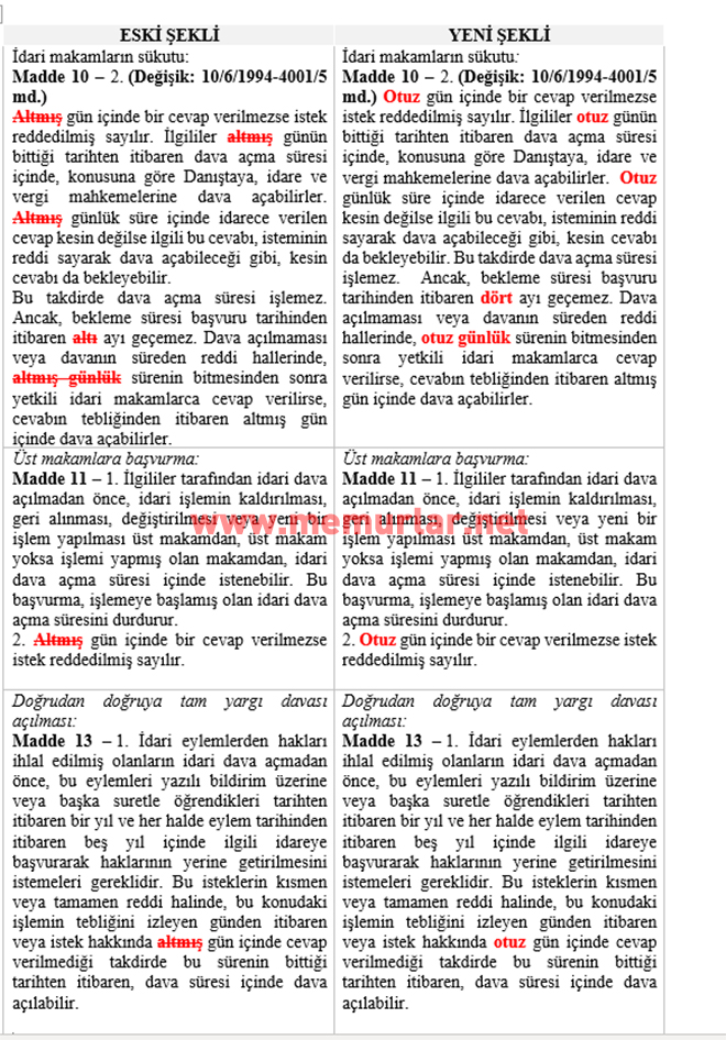 TBMM'ye sevk edilen teklife göre idari makamların istekleri yanıtlama süresi 60 günden 30 güne indirilirken, idari yargıda kararların verildiği tarihten itibaren 30 gün içinde yazılması da hüküm altına alınıyor.