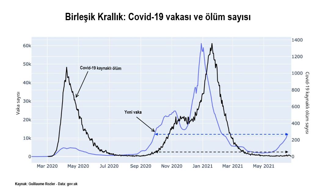 İngiltere'de son haftalarda artan vaka sayısı ile Covid-19 kaynaklı ölüm grafiğine baktığımızda, aşılama kampanyası ve Covid-19 ölümleri arasında bir korelasyon olduğu ortaya çıkıyor. Ancak ikisi arasında sebep ve sonuç ilişkisinin olup olmadığı henüz kesin olarak açıklanması mümkün değil.