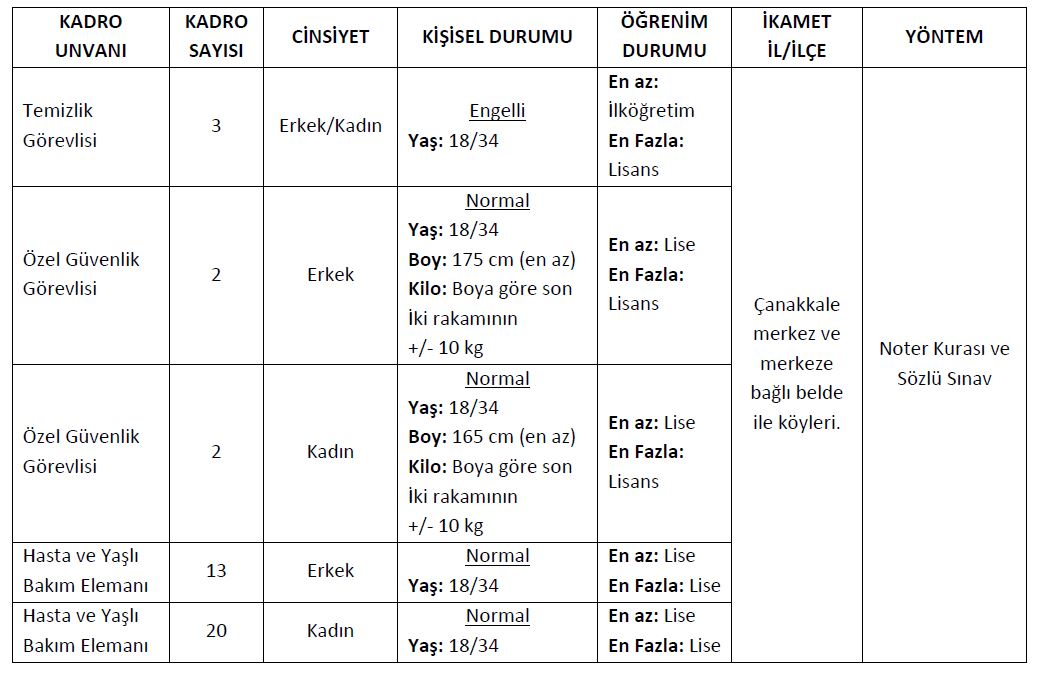 Çanakkale 18 Mart Üniversitesi Rektörlüğü ve bağlı birimlerinde çalıştırılmak üzere 4857 sayılı İş Kanunu ve Kamu Kurum ve Kuruluşlarında İşçi Alınmasında Uygulanacak Usul ve Esaslar Hakkında Yönetmelik kapsamında Türkiye İş Kurumu (İŞKUR) aracılığıyla tabloda yer alan kadrolara Sürekli İşçi alımı yapılacaktır.
