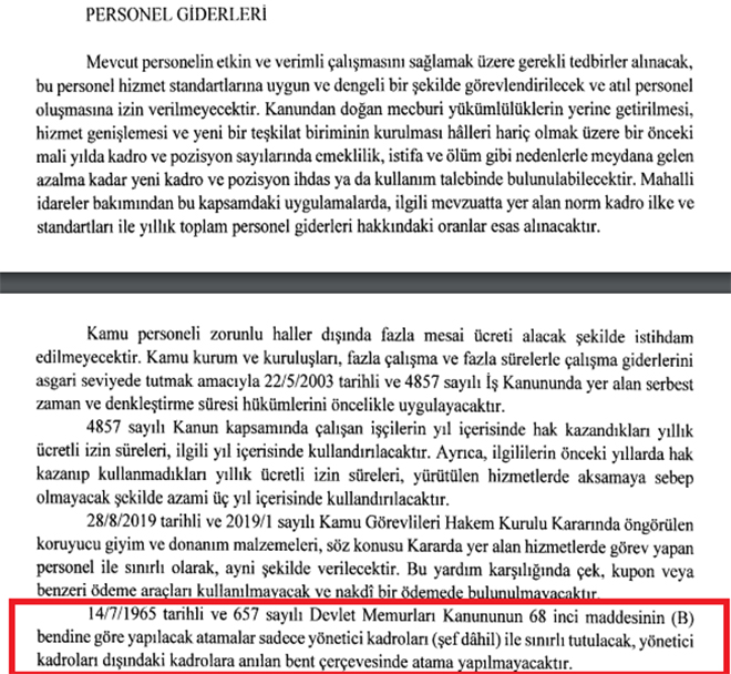 Bunun bir devamı olarak, kamuda ilk kez torba kadroları atamalarına sınırlandırılma getirilmesi bugünkü Resmi Gazete'de yayımlanan Tasarruf Tedbirleri konulu genelgede hüküm altına alınmış oldu. Anılan Genelge'nin "PERSONEL GİDERLERİ" başlıklı bölümünün son paragrafında; "14/7/1965 tarihli ve 657 sayılı Devlet Memurları Kanununun 68 inci maddesinin (B) bendine göre yapılacak atamalar sadece yönetici kadroları (şef dahil) ile sınırlı tutulacak, yönetici kadroları dışındaki kadrolara anılan bent çerçevesinde atama yapılmayacaktır" denilmiştir.