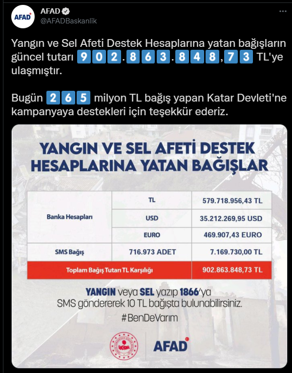 AFAD'ın Twitter hesabından yapılan paylaşımda, yangın ve sel afeti destek hesaplarına yapılan yardımın 902 milyon 863 bin 848 liraya ulaştığı duyuruldu. Paylaşımda, "265 milyon TL bağış yapan Katar Devleti'ne kampanyaya destekleri için teşekkür ederiz" ifadesi yer aldı. Paylaşımda, "YANGIN" veya "SEL" yazıp 1866'ya SMS gönderilerek 10 lira bağışta bulunabileceği hatırlatıldı.