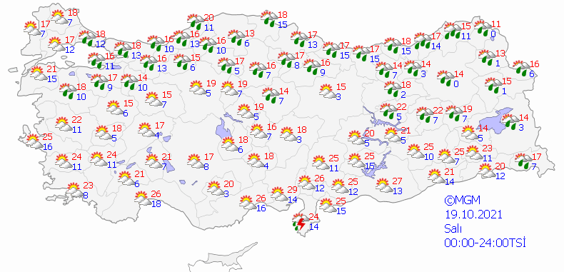 Meteoroloji Genel Müdürlüğü tarafından yapılan son değerlendirmelere göre: Marmara, Kuzey Ege, Karadeniz bölge geneli, Adana, Osmaniye, Hatay, Eskişehir, Ankara, Çankırı ve Ardahan çevreleri ile Antalya'nın doğu kesimlerinin sağanak ve gök gürültülü sağanak yağışlı geçeceği tahmin ediliyor. Yağışların; Batı Karadeniz bölge geneli ile Orta ve Doğu Karadeniz kıyı kesiminde yerel kuvvetli olması bekleniyor.