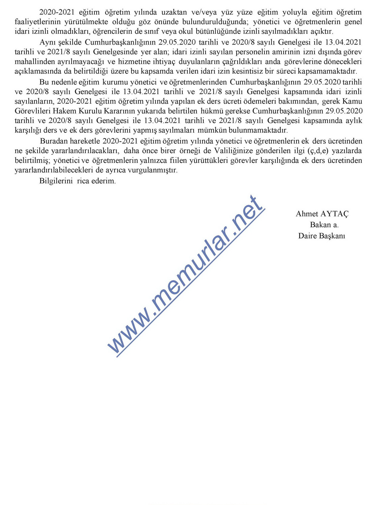 Milli Eğitim Bakanlığı, Cumhurbaşkanlığının 29.05.2020 tarihli ve 2020/8 sayılı Genelgesine atıfta bulunarak, gebeliğinin yirmi dördüncü haftasından otuz ikinci haftasına kadar olan sürelerde idari izinli sayılanların, bu sürelerde ek ders ücretinden yararlandırılmaması gerektiğini belirtti.